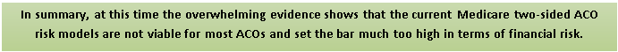 - Address the growing evidence that the current two-sided ACO risk models are not attractive for most ACOs and set the bar much too high in terms of financial risk,