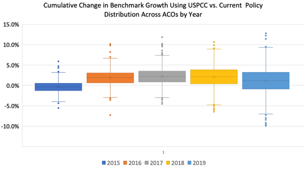 An alternative approach is to use a quartile-based benchmark system, similar to Medicare Advantage, which would adjust the caps based on the ACOs’ spending compared to the region. For example, an ACO whose spending is 10 percent below their region could be capped at 5 percent while an ACO that is 20 percent below their region’s spending could be capped at 7.5 percent. Currently, CMS policy of ratcheting every ACO back to a 5 percent savings rate at the start of each new contract prevents any long-term investments that would require greater than a 5 percent savings rate to generate a return. This ratchet does not just cap savings, it caps investments in beneficiaries, and it caps how much an ACO can truly transition away from FFS and towards value.