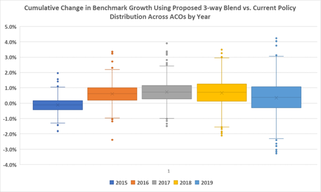 - Put sufficient guardrails in place, if the agency finalizes the proposed three-way trend update, to protect ACOs who would see lower benchmarks because of the ACPT. Specifically, we recommend CMS set ACOs’ historic benchmark at the higher of the proposed three-way trend adjustment or the current two-way trend adjustment.
