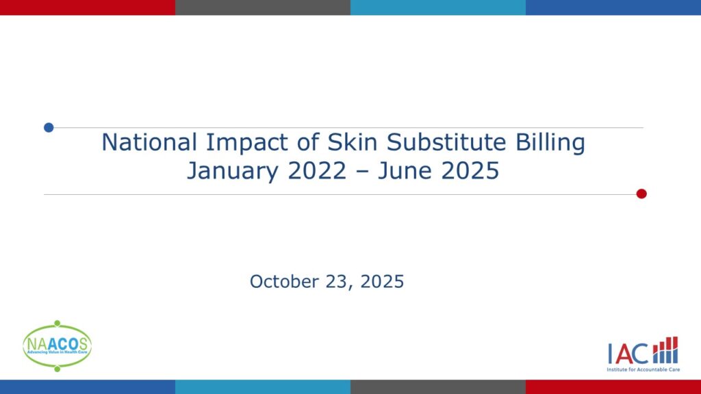 WASHINGTON (October 23, 2025) – A new analysis of Medicare data by the National Association of ACOs and the Institute for Accountable Care shows that spending on skin substitute products reached $7.7 billion through July 2025 and is projected to reach $15.4 billion by the end of 2025, a 55% increase over 2024 spending. The accelerated spending comes as many accountable care organizations (ACOs) seek action by the Centers for Medicare & Medicaid Services (CMS) to address payment flaws and ensure ACOs are held harmless for fraud, waste, and abuse that occur beyond their control.
